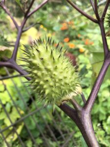Aus den Blüten entstehen kleine pieksige Kapselfrüchte, die sich zum recht großen Stechapfel ausreifen. Nach der Reife springt die Kapsel auf und gibt die schwarzen Samen frei.