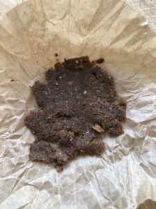 So wurde dann zerbröselt, geschnitten, gemörsert, vermatscht und verrührt. Das fertige und schon sehr fein duftende Kyphi muss zuhause noch getrocknet werden, um es dann zum Räuchern auf Kohle oder Sieb einsetzen zu können.