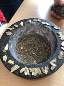 Die Gemeinschaftsarbeit war dann die Herstellung von Kyphi, ein rekonstruiertes Rezept aus dem ägyptischen Tempel Edfu, der dem Falkengott geweiht war.