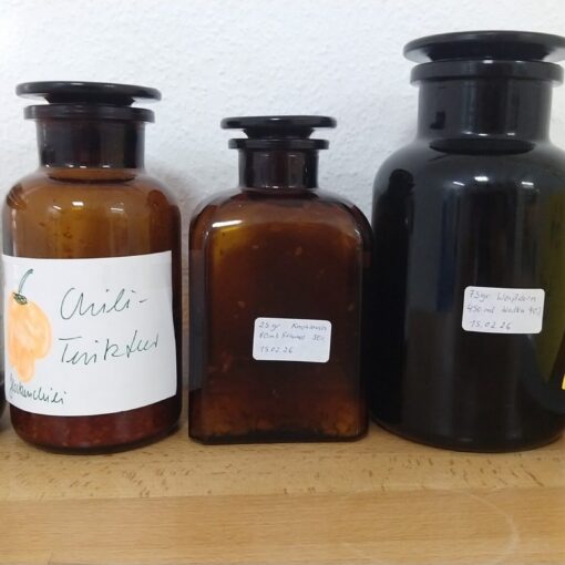 Dieses Wochenende ging es um die Grundlagen und die Geschichte und es wurden zwei Ansätze gemacht, die an den nächsten Wochenenden abgefüllt werden sollen (Unmengen von gemörsertem Chili in Alkohol, der, glaube ich mit Beinwell gemischt werden wird und Blütenknospen für die Gemmotherapie und beides muss und wird die nächsten vier Wochen bis zum nächsten Wochenende regelmäßig geschüttelt.)